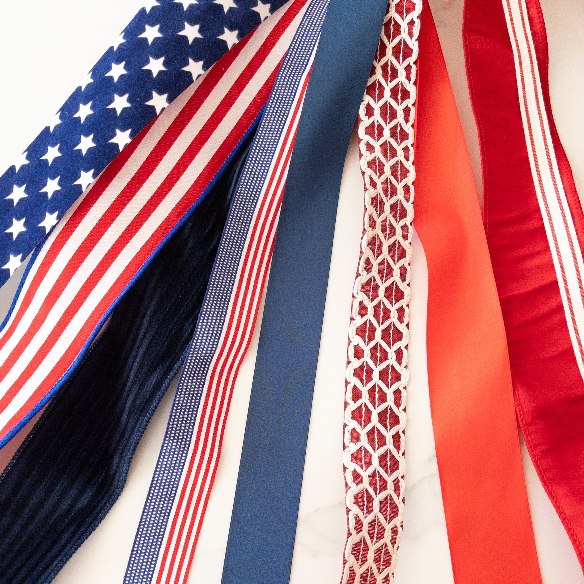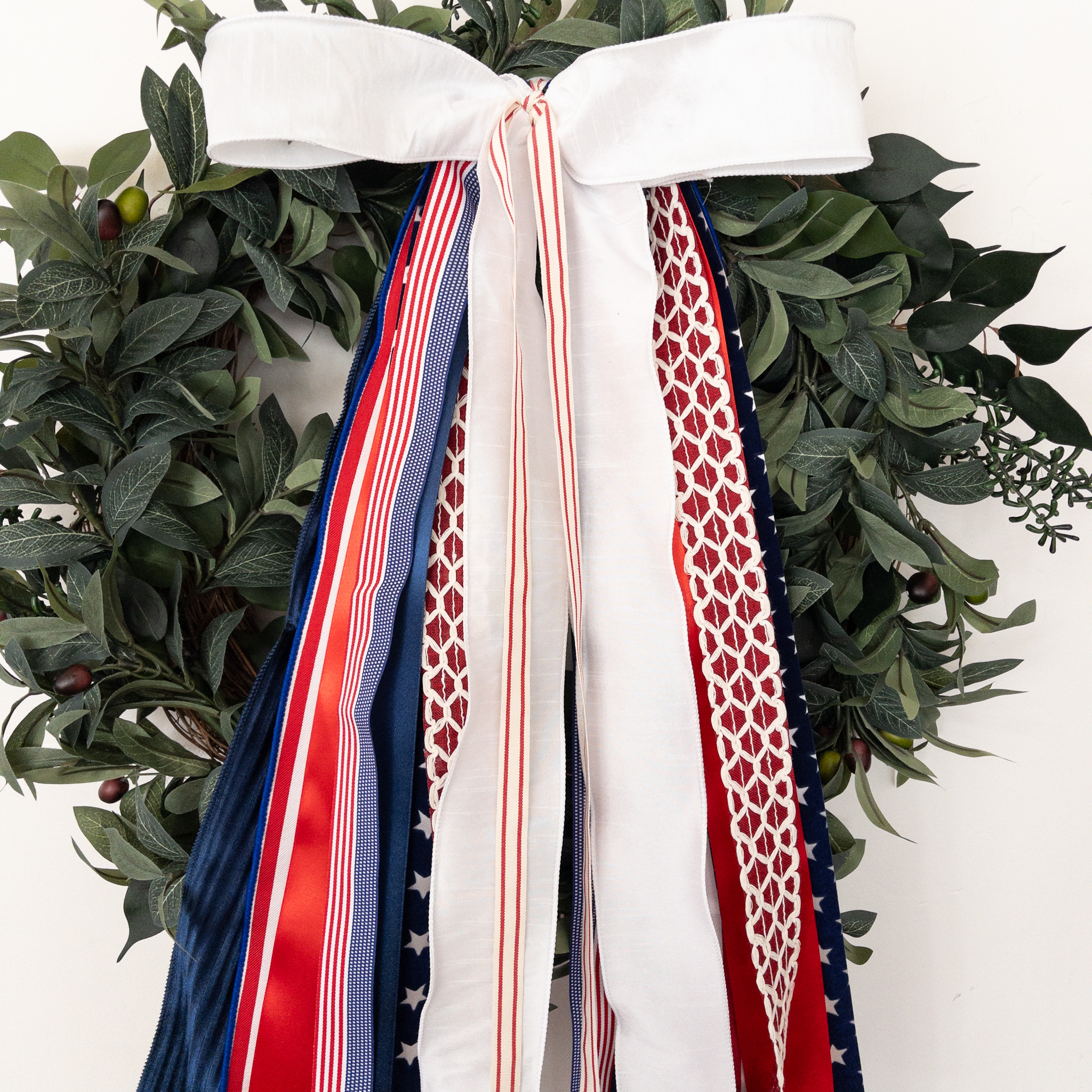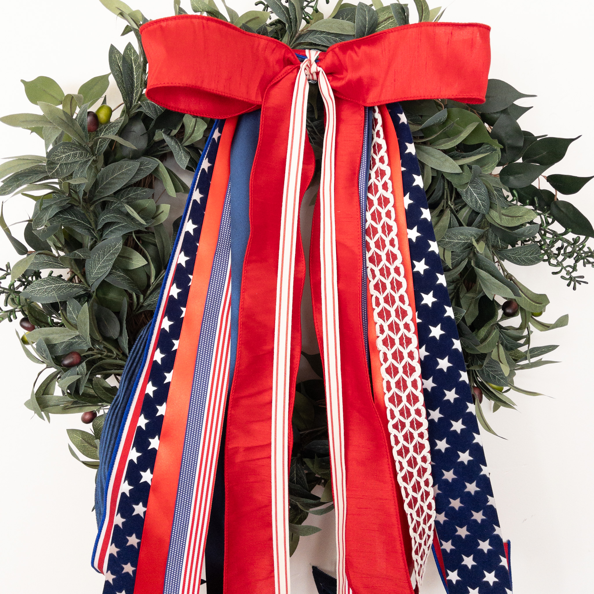 ➼ This dramatic layered ribbon drop features a show-stopping mix of satin, velvet, and dupioni. Deep reds, crisp whites, and navy accents create a luxe, high-contrast look perfect for wreaths or door displays.
