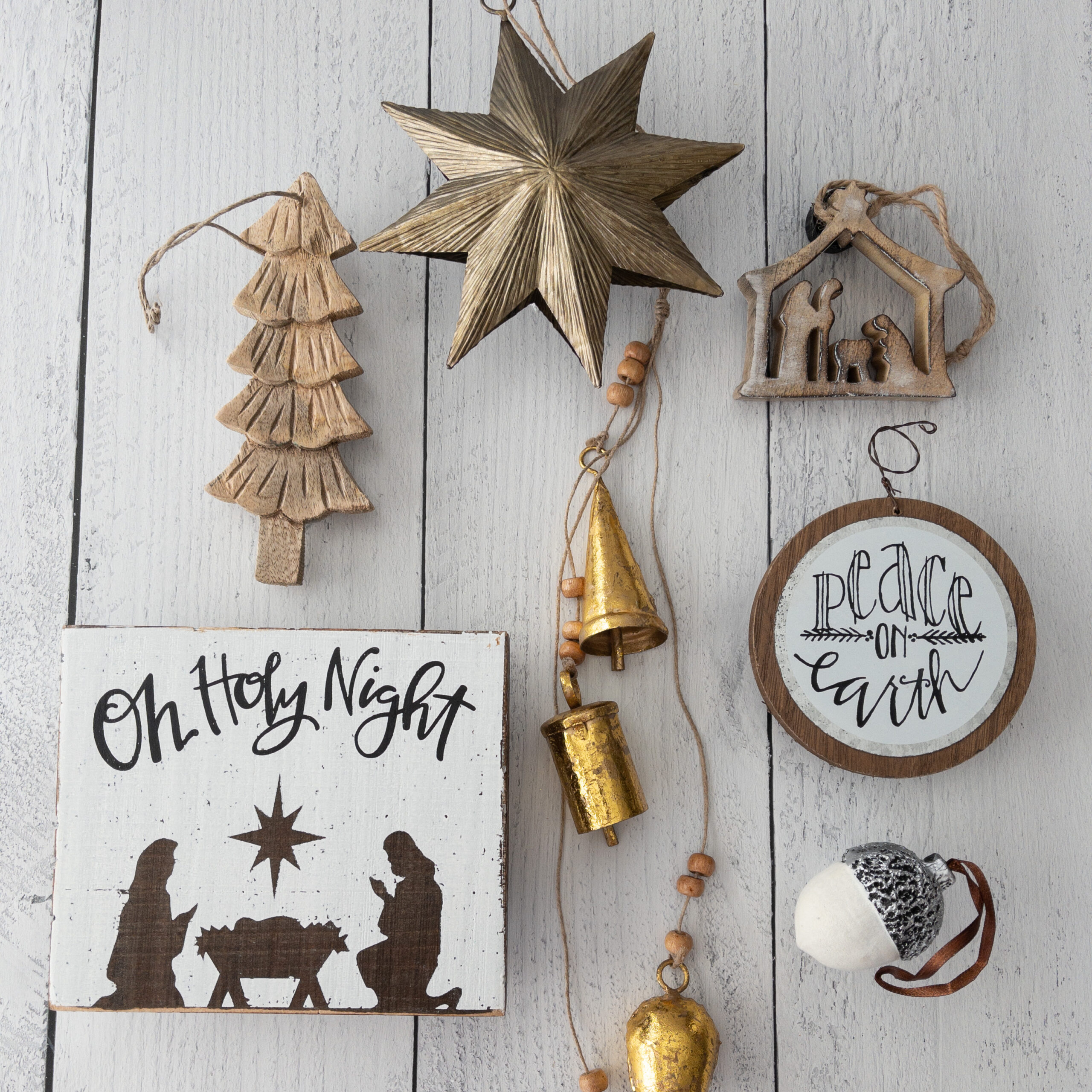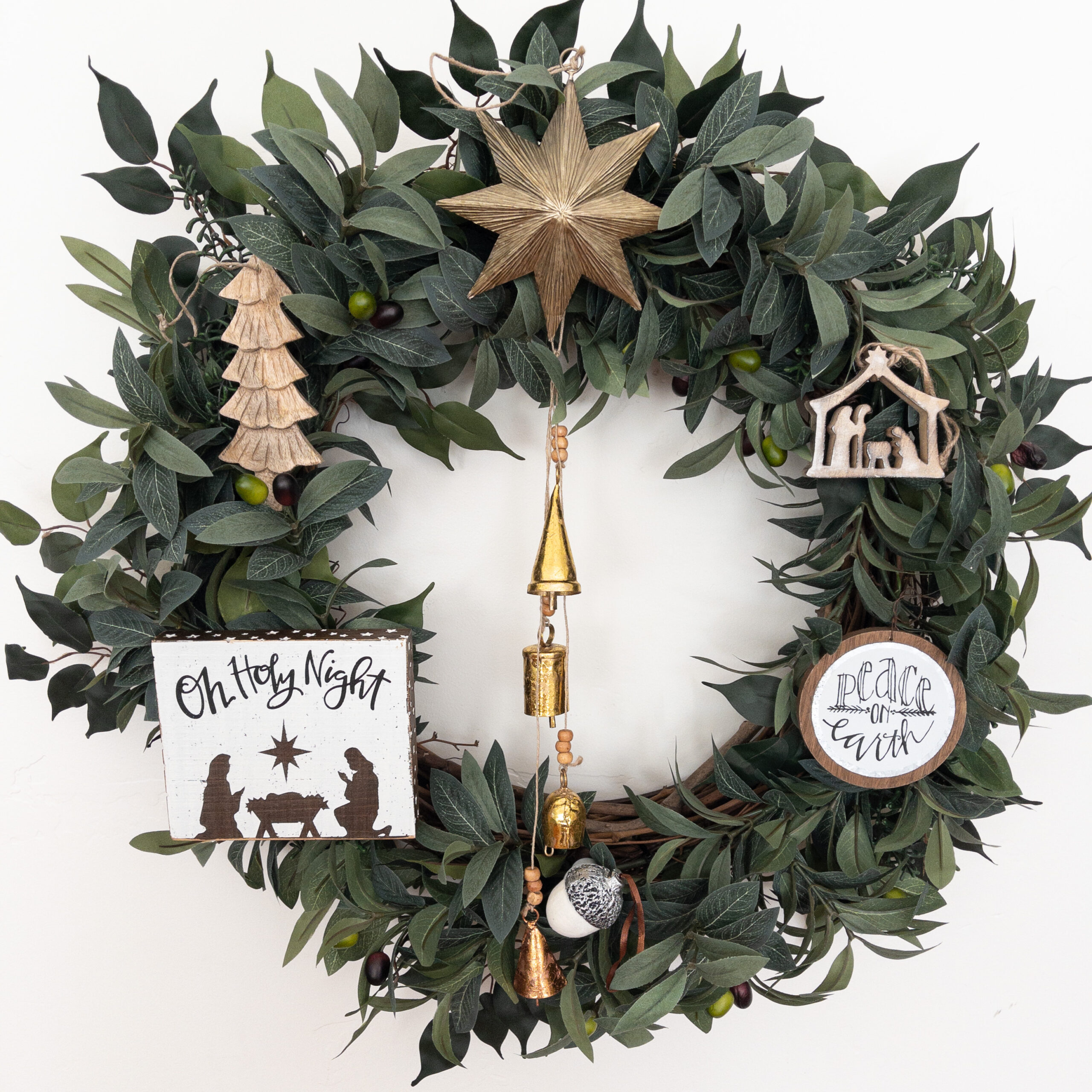 ➼ This Holy Night kit is a beautiful rustic farmhouse version of the Nativity. The gold and brass bells hang through the center of the wreath with a metal star a top the wreath.