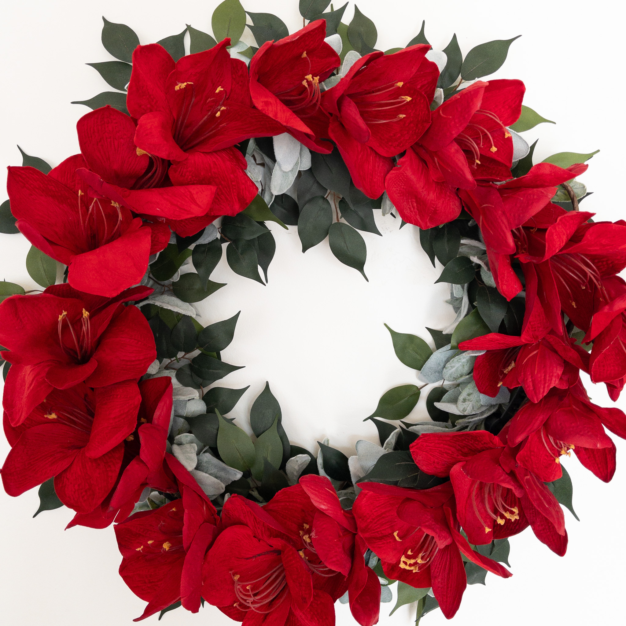 ➼ Transform your ONE SIMPLE WREATH with this brilliant red Amaryllis garland. This luxe garland cannot be found in craft stores. Each bloom is beautifully embellished into a garland arrangement and constructed in detail to accentuate the deep red hues of a true flower. Wrap around your One Simple Wreath base and snap each connected section in place. Each garland is secured on our patented spray caps. Please note that this garland is specifically made for our 24" inch wreaths.