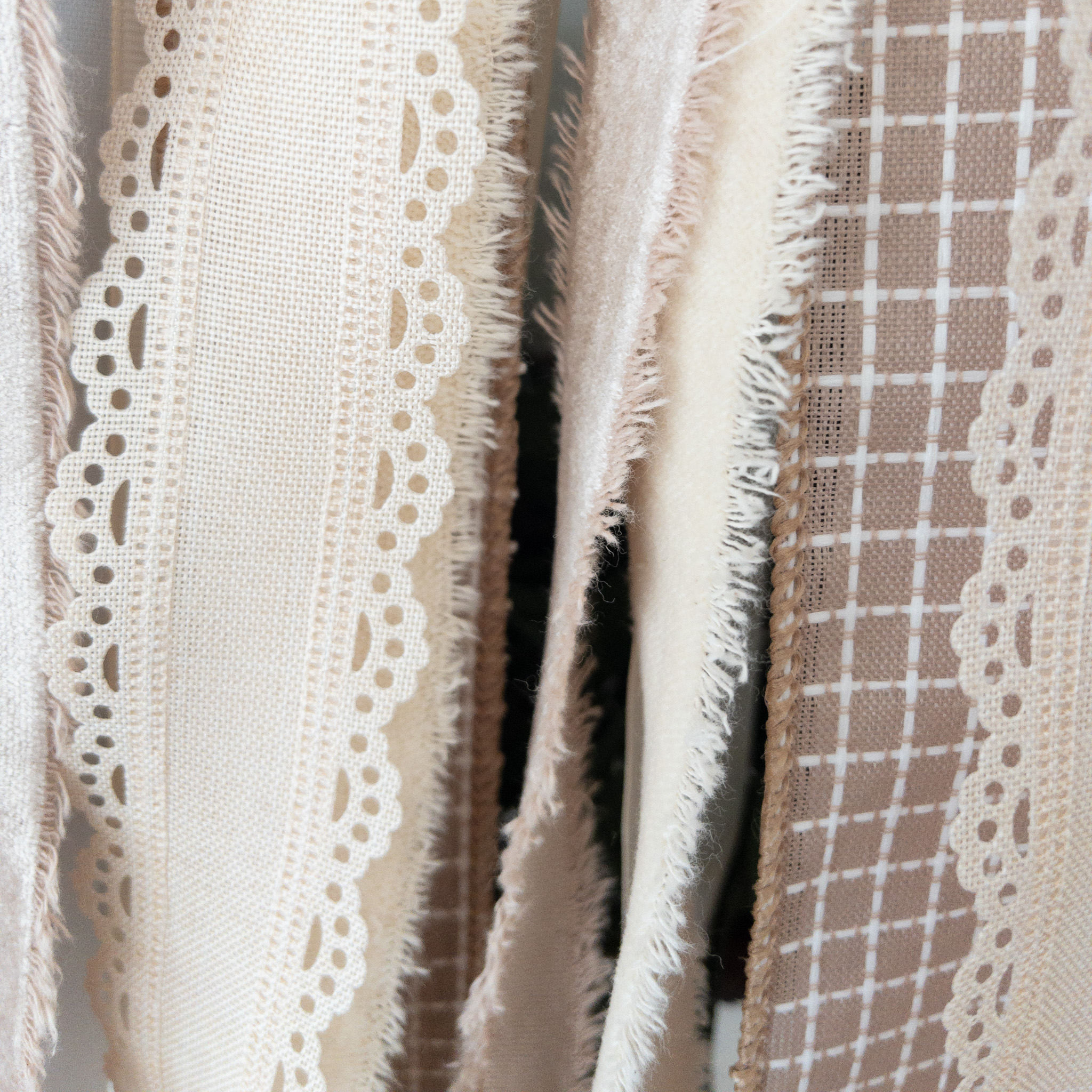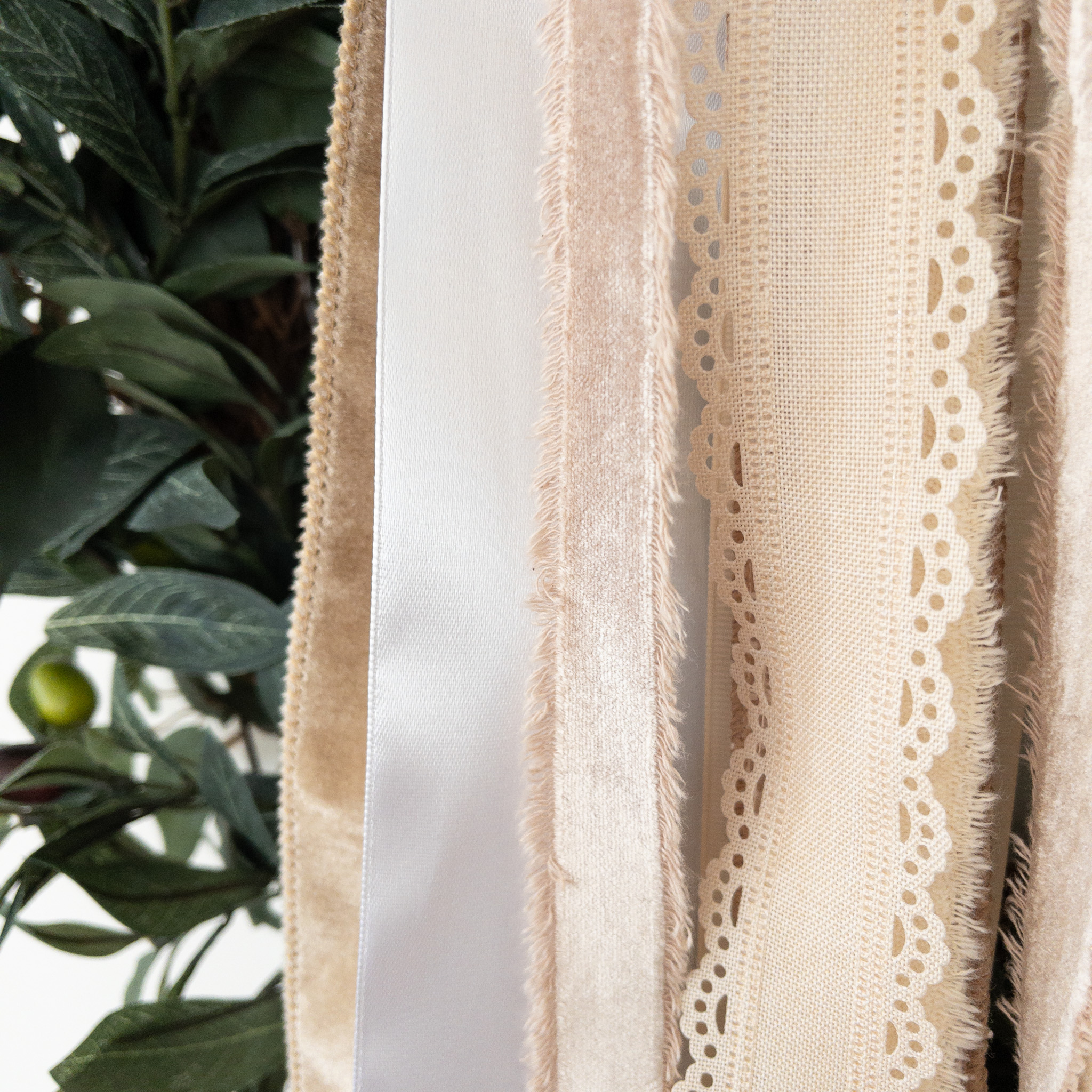 ➼ This dramatic layered ribbon drop features a show-stopping mix of satin, canvas, velvet and cotton with gentle tan and cream tones, and delicate scalloped details. This set is perfect for an every day look or pair it with any neutral kit from One Simple Wreath.