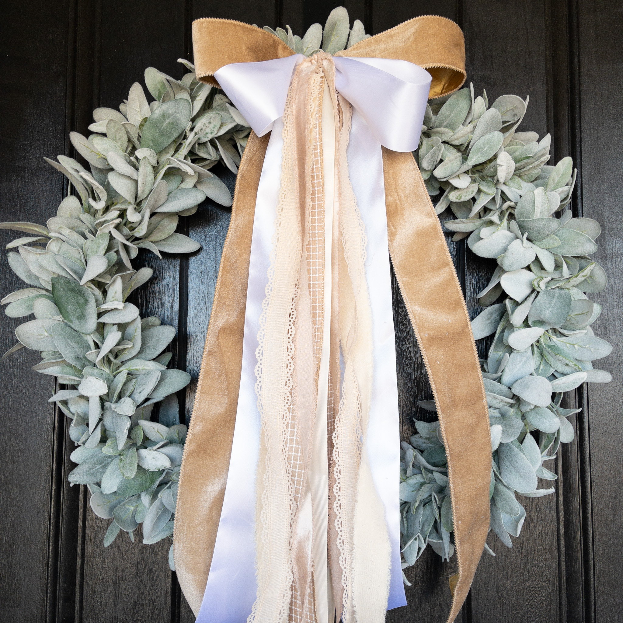 1- camel velvet luxe bow with a double white satin bow or a champagne double bow and at least 5 coordinating ribbon tails. Please note that ribbons may not be exactly as picture shows. Each set includes coordinating ribbons. This ribbon set DOES include our attachment cap on the back. Simply snap on to your ONE SIMPLE WREATH base post for a beautiful contrast of spunk and color.